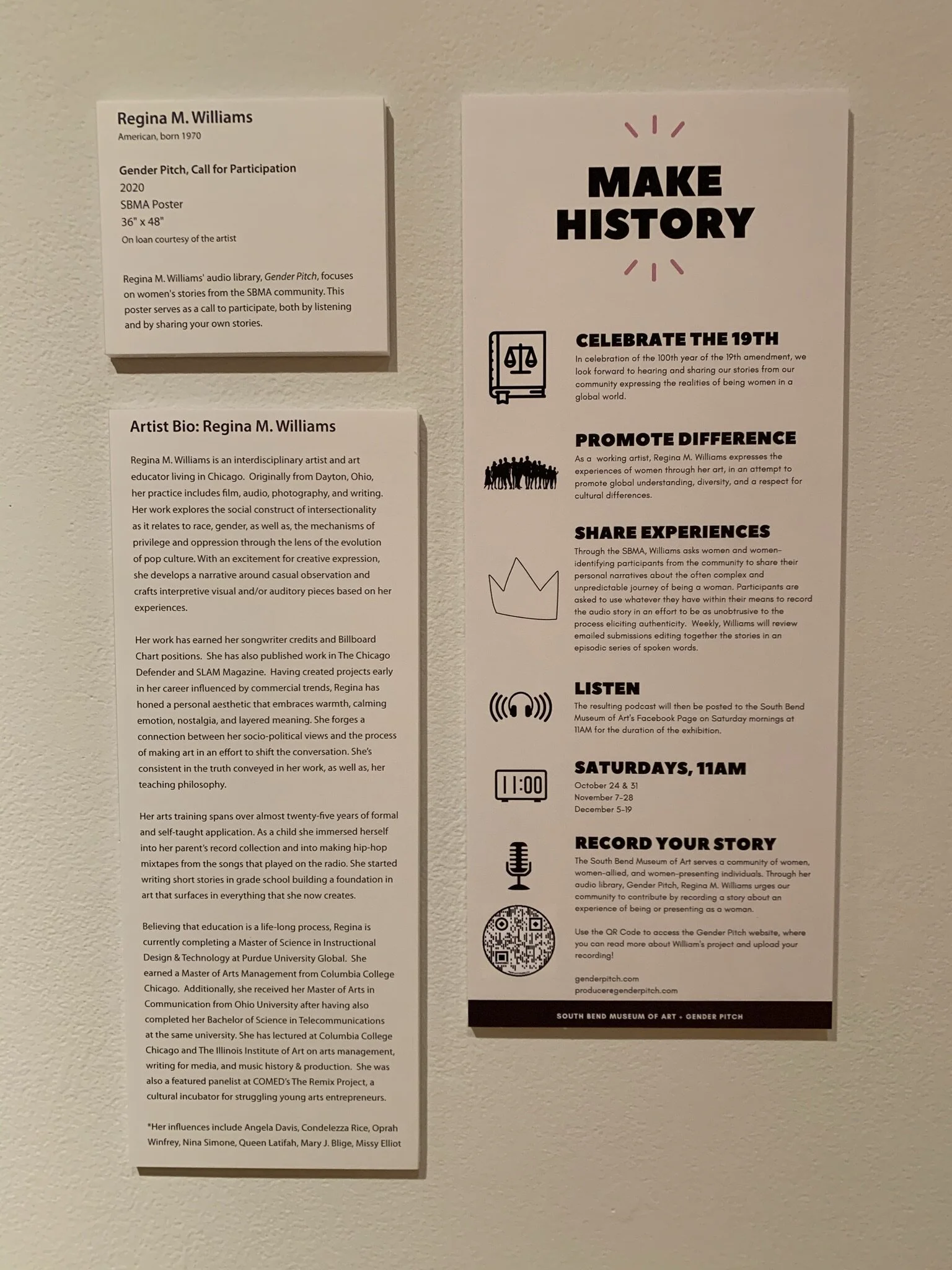 Through artist interviews, works of art, and a weekly podcast, the show demonstrates the strength, power and successes of regional women artists. As a working artist, Regina M. Williams expresses the experiences of women through her art, in an attempt to promote understanding, diversity, and a respect for cultural differences. She asks women and women-identifying artists to share their personal narratives about the often complex and unpredictable journey of being a woman. Weekly, Williams will review emailed submissions, editing together the stories in an episodic series of spoken words. The resulting podcast will be posted on Saturday mornings for the duration of the exhibition. Viewers will have the opportunity to interact within each of these artists’ practices through various activities inspired by or created by the artist, accessible through a virtual tour space or by reading the QR codes in the gallery.